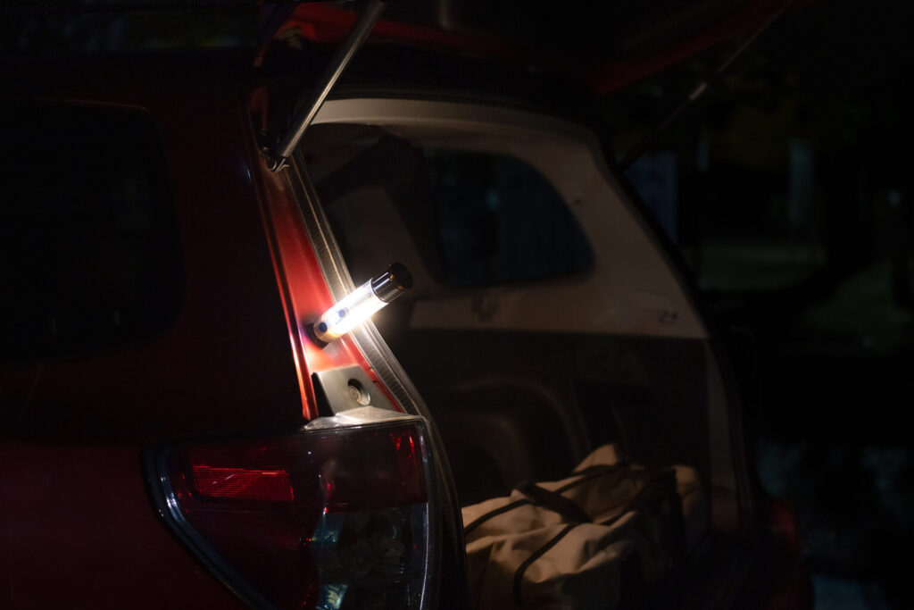 上部の強力マグネットも同じ思想から生まれています。避難所の鉄柱や車のボディに固定できれば、両手が自由になる。
