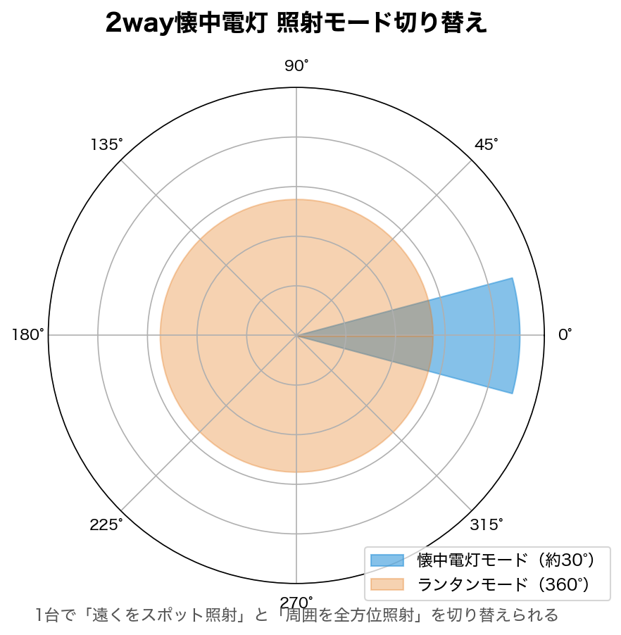 ルーメンと同じくらい重要なのが、光の広がり方を示す「ビーム角(照射角)」です。広角(100°以上)は手元作業向き、狭角(30°前後)は遠距離スポット向きという原則を覚えておくと、ライト選びが格段にシンプルになります。
