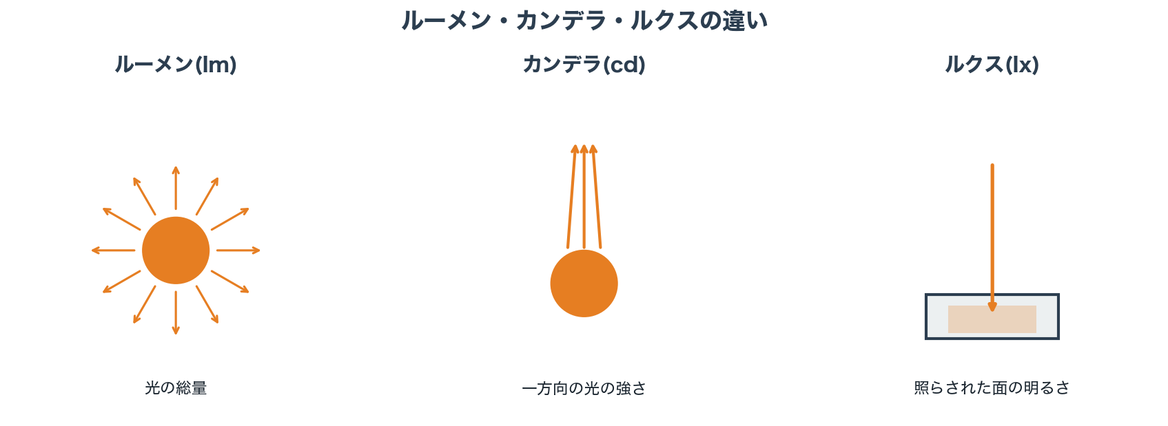 - ルクスは「照らされた面の明るさ(照度)」のことです。ルーメンが「出る量」、カンデラが「飛ぶ強さ」、ルクスが「届いた結果」と覚えると整理しやすいでしょう。光源から遠くなるほど、ルクス値は低下します。