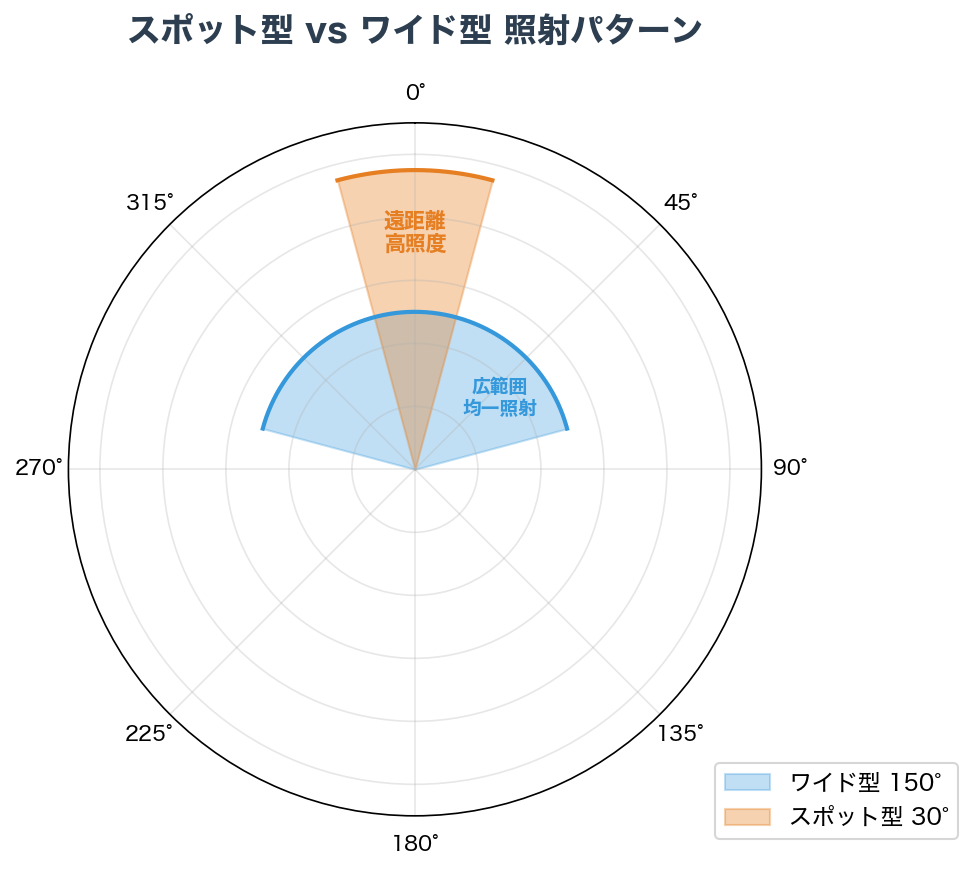 照明性能を語るとき、多くの製品は「〇〇ルーメン」という数値だけを前面に出します。しかしルーメンは光の総量であり、「どこに・どのように光が届くか」という照射設計とは別の話です。同じ1000ルーメンでも、光の広がり方・集光の仕方によって、現場での実用性は大きく変わります。